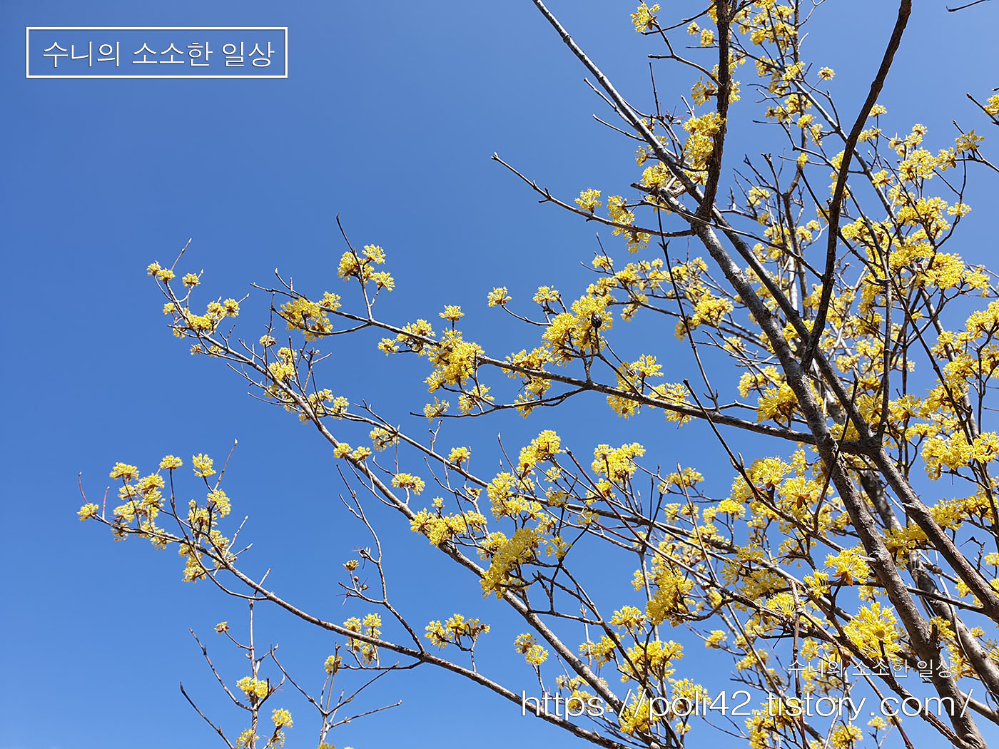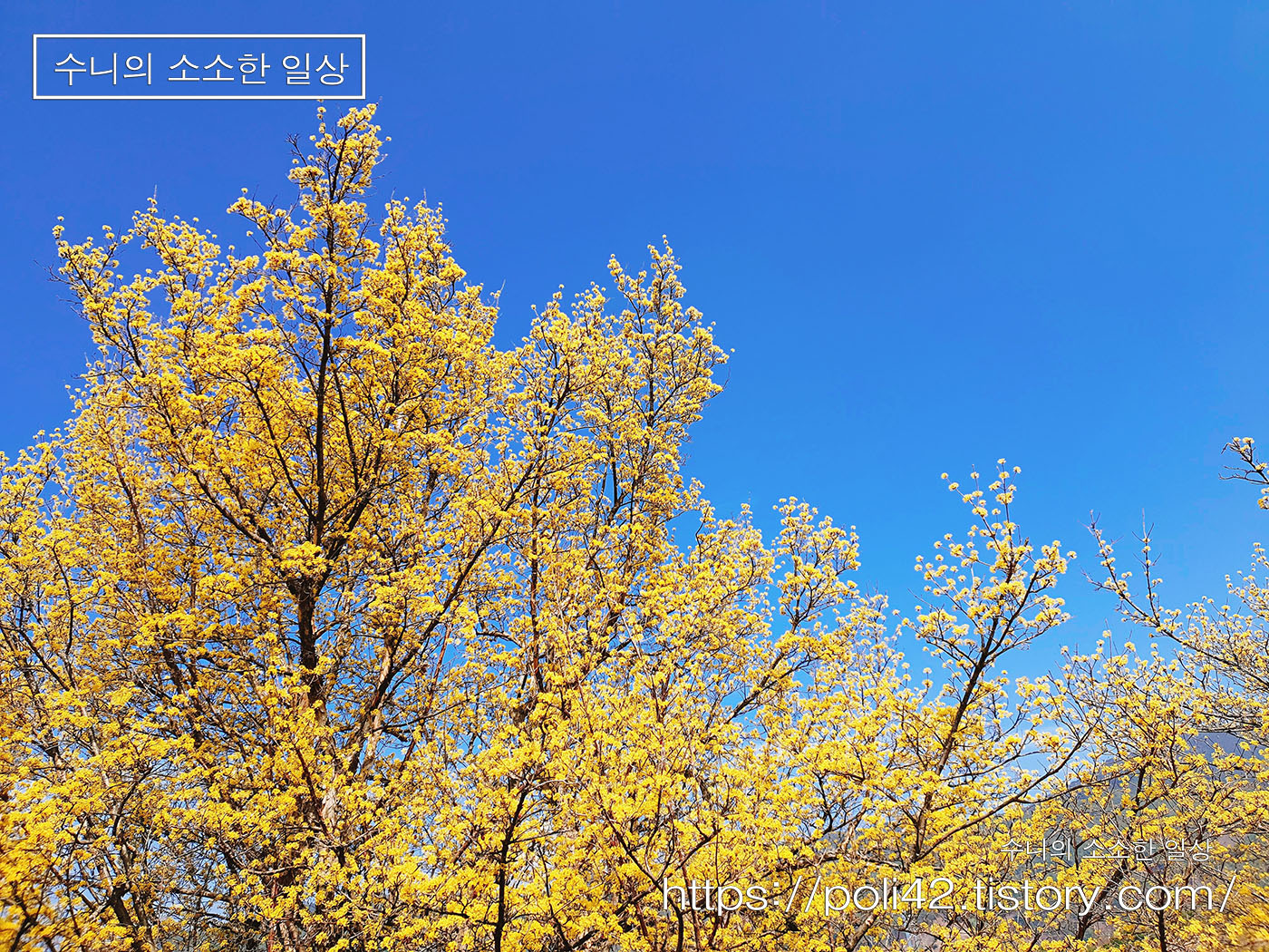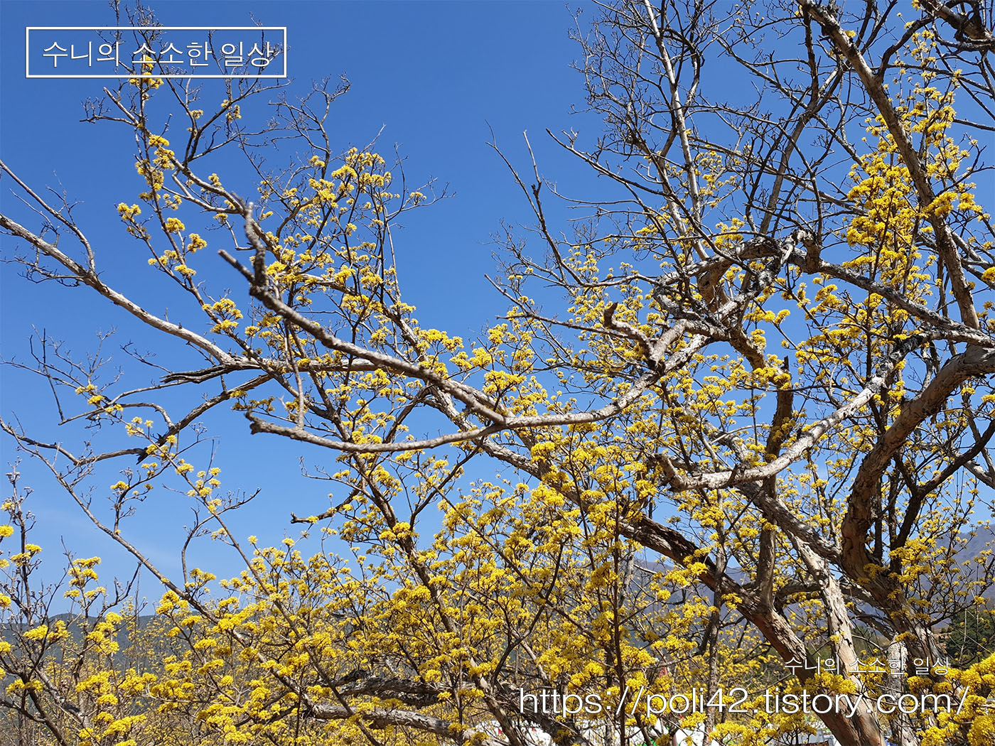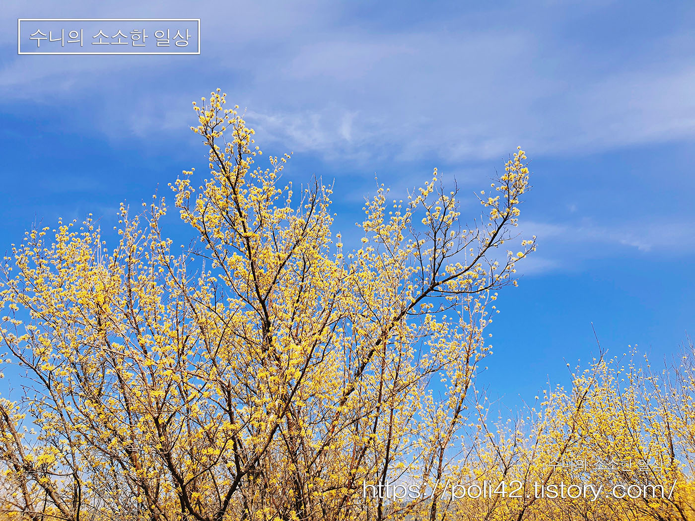 하늘의 푸른색과 노오란 산수유꽃의 색이 너무 조화롭습니다.
