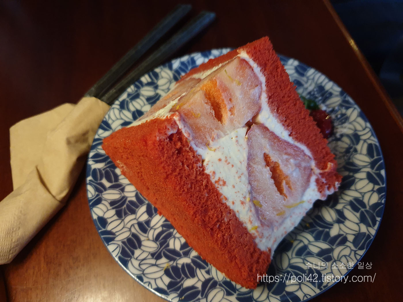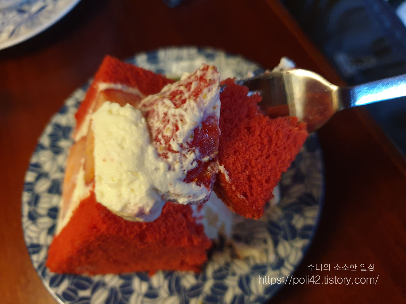부드러운 생크림 사이에 상큼한 딸기가 들어간 레드벨벳 산도,