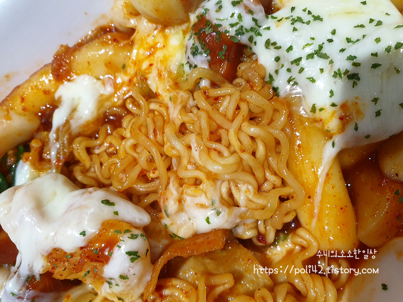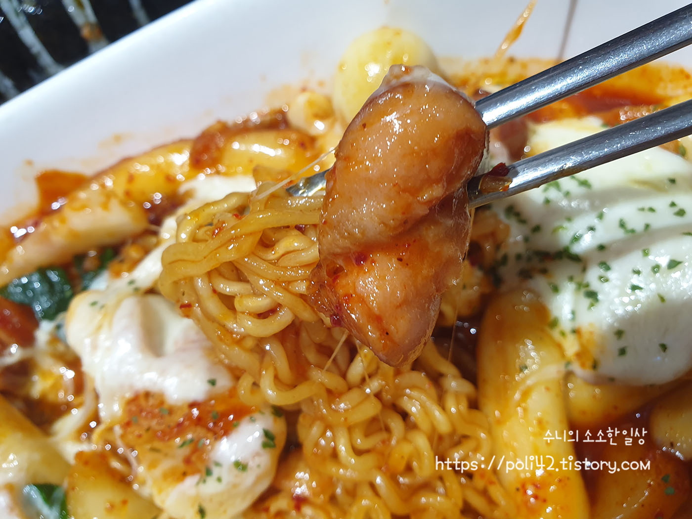 치즈와 야채, 소세지, 라면사리와 메추리알, 쫄깃한 떡이 들어있고