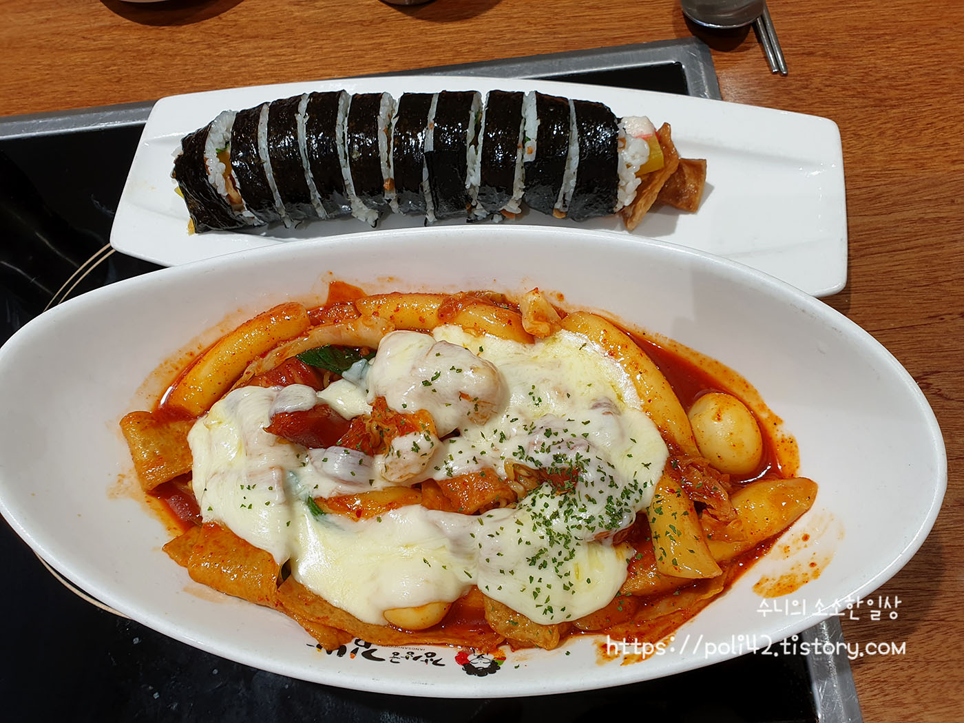 주문한 마약떡볶이와 참치마요 김밥 등장.
