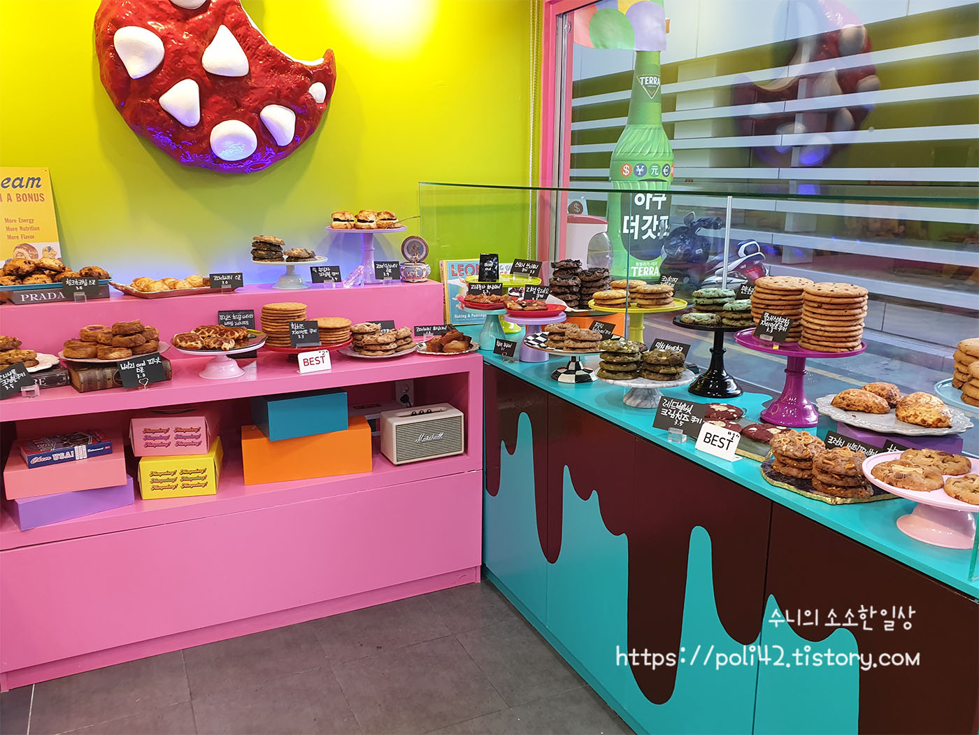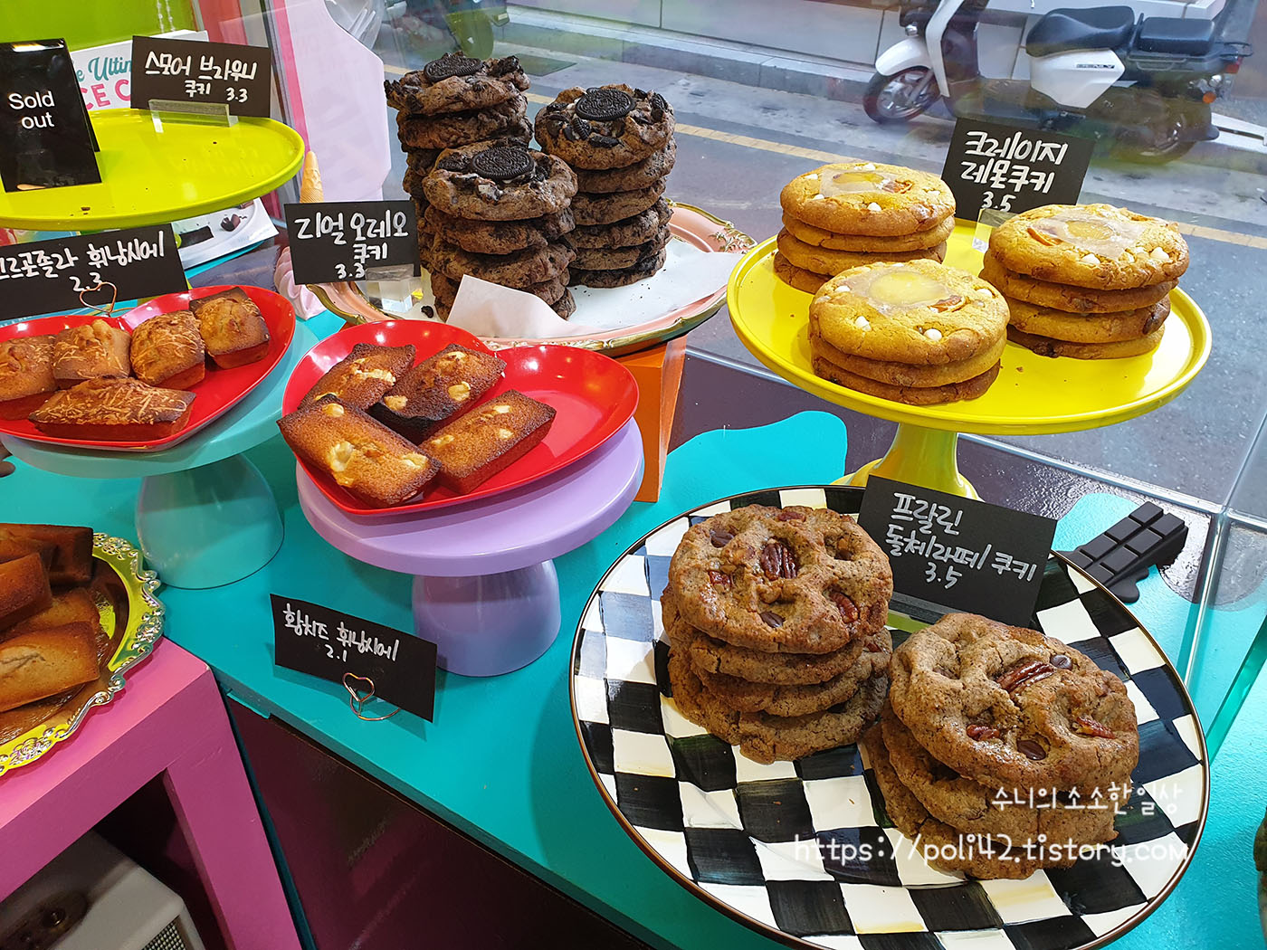 창가 쪽으로는 먹음직스러운 쿠키들이 진열되어 있습니다.