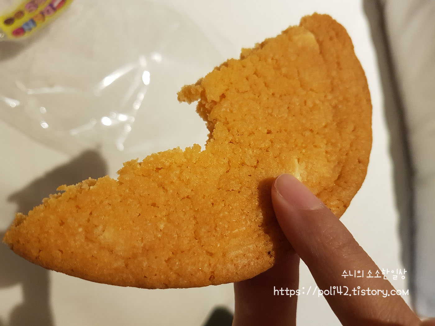 많이 달고, 촉촉한 스타일로 체다치즈 향이 아주은은하게 느껴지는 쿠키.