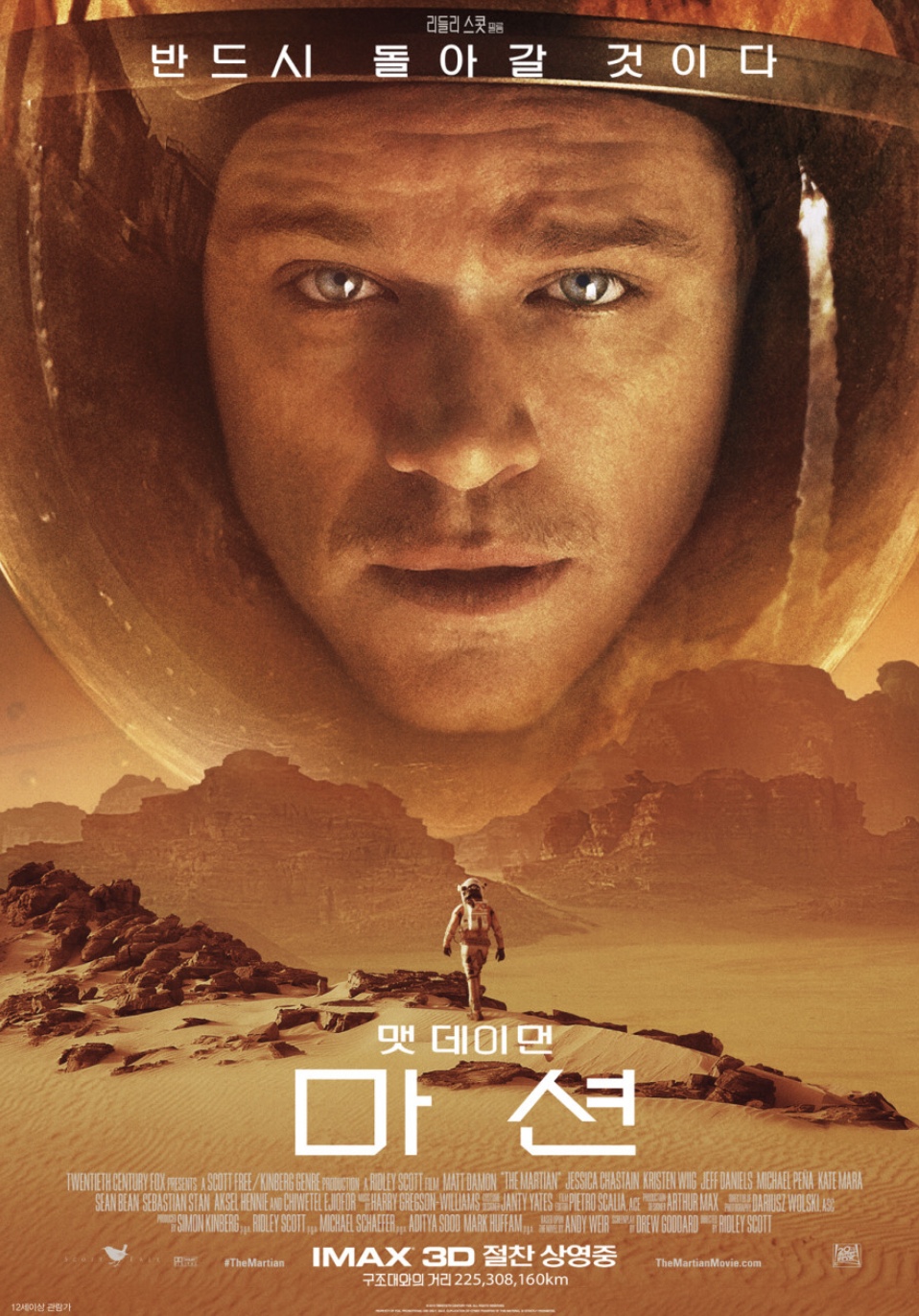 극적으로 생존한 마크 와트니는 남은 식량과 기발한 재치로 화성에서 살아남을 방법을 찾으며