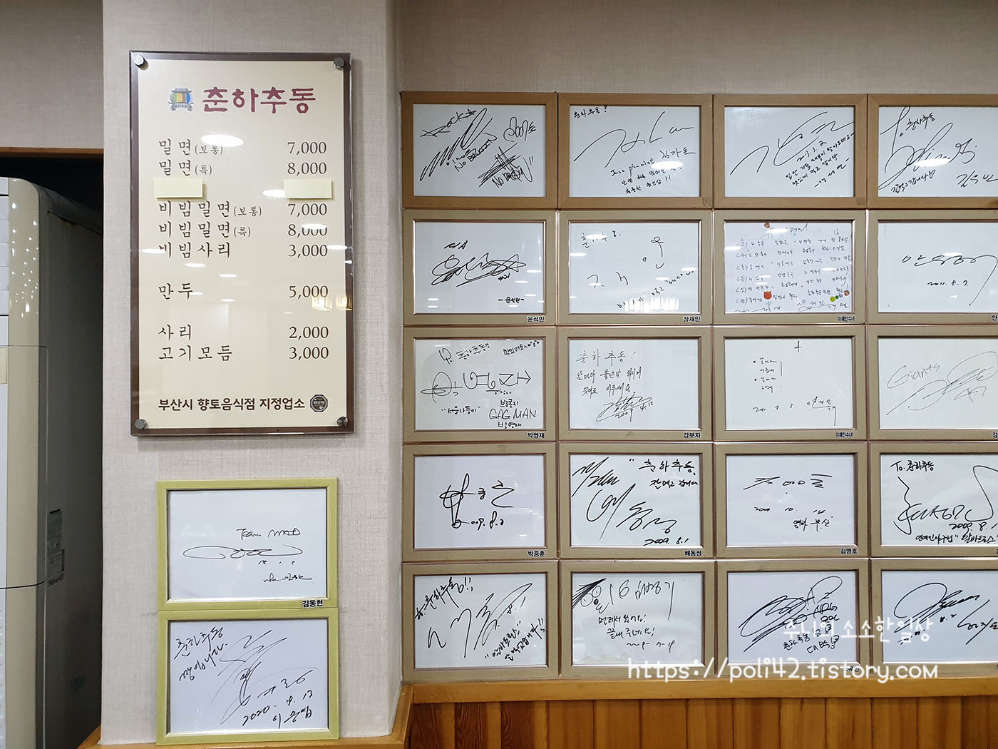 앉은자리 옆으로는 많은 연예인 분들의 사인이 가득하네요.