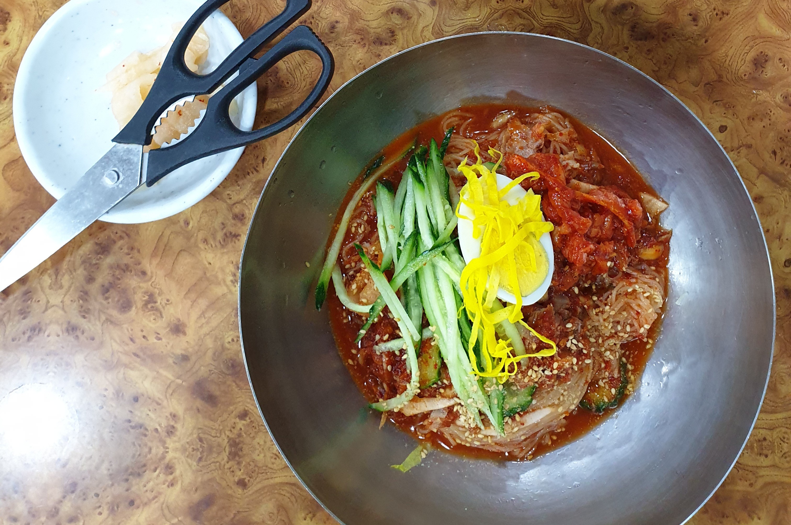 잠시 후, 기본 반찬과 함께 밀면이 나왔습니다.