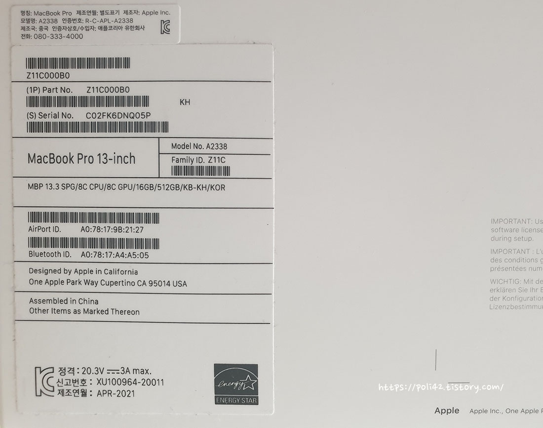 뒷면에는 제가 구입한 맥북의 정보가 적혀있습니다.