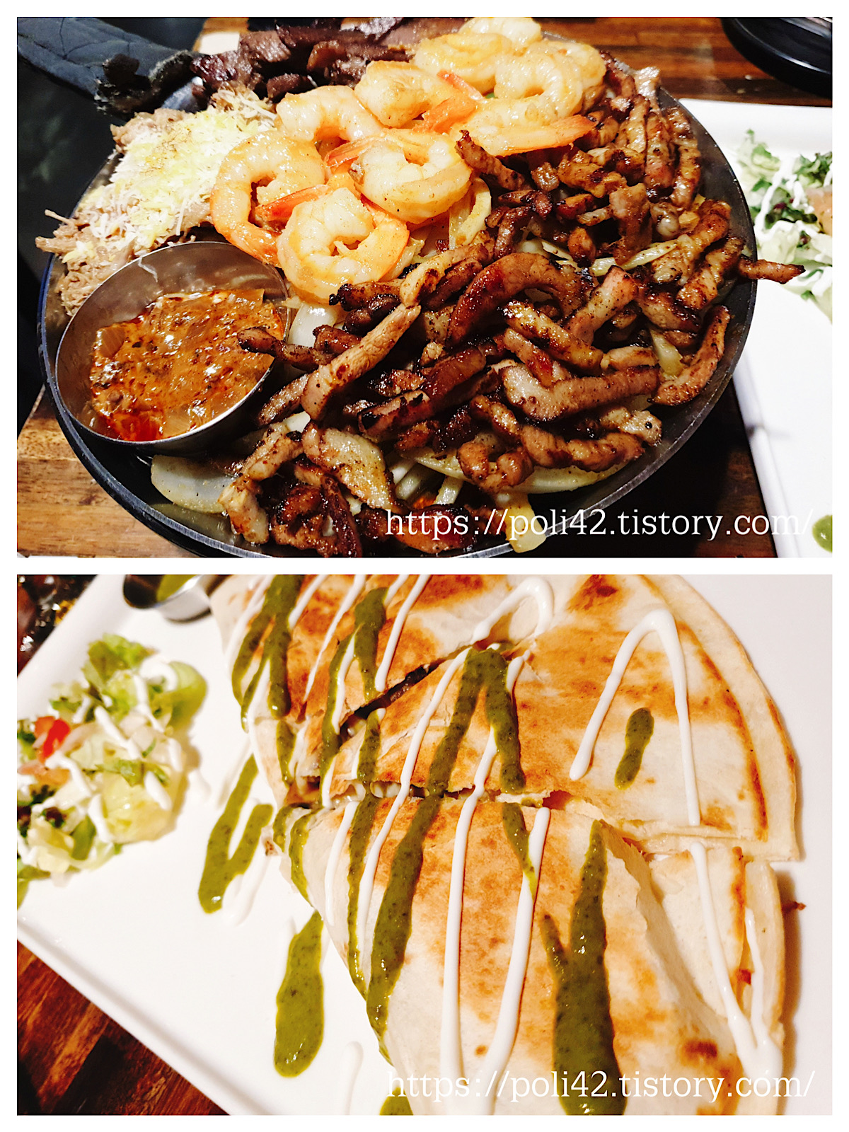 팬 가득 새우와 소고기, 돼지고기가 올라가 있고 고기들 아래로 잘 보이진 않지만 구운 양파가 있는 감성 그릴드 파지타.