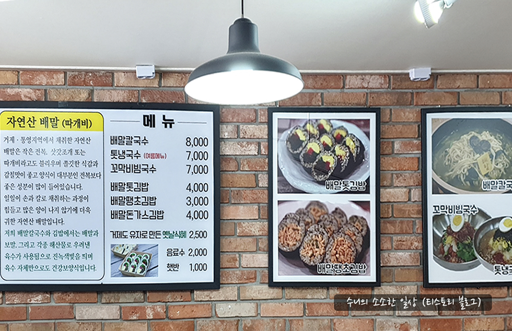 가장 유명한 메뉴는 배말 칼국수와 배말 톳 김밥이에요.