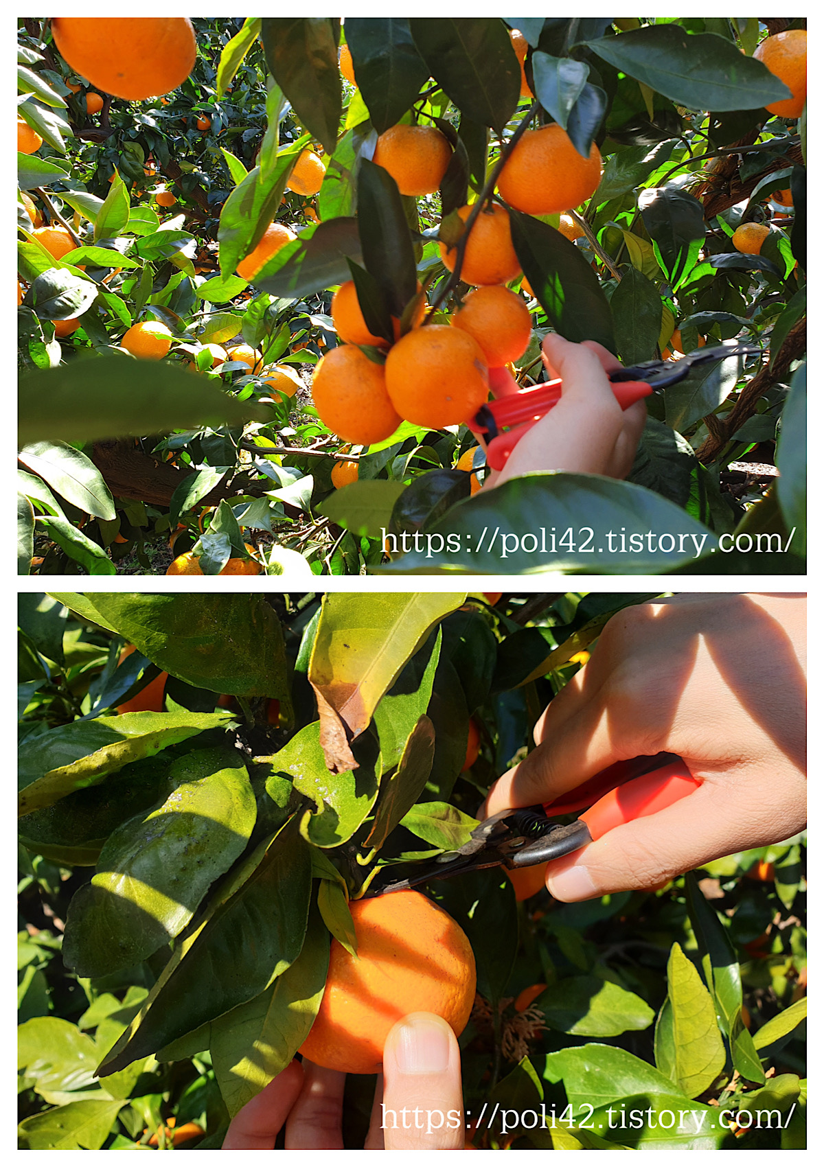 귤을 딸 때는 꺾거나 당겨서 손으로 따는 것이 아니라