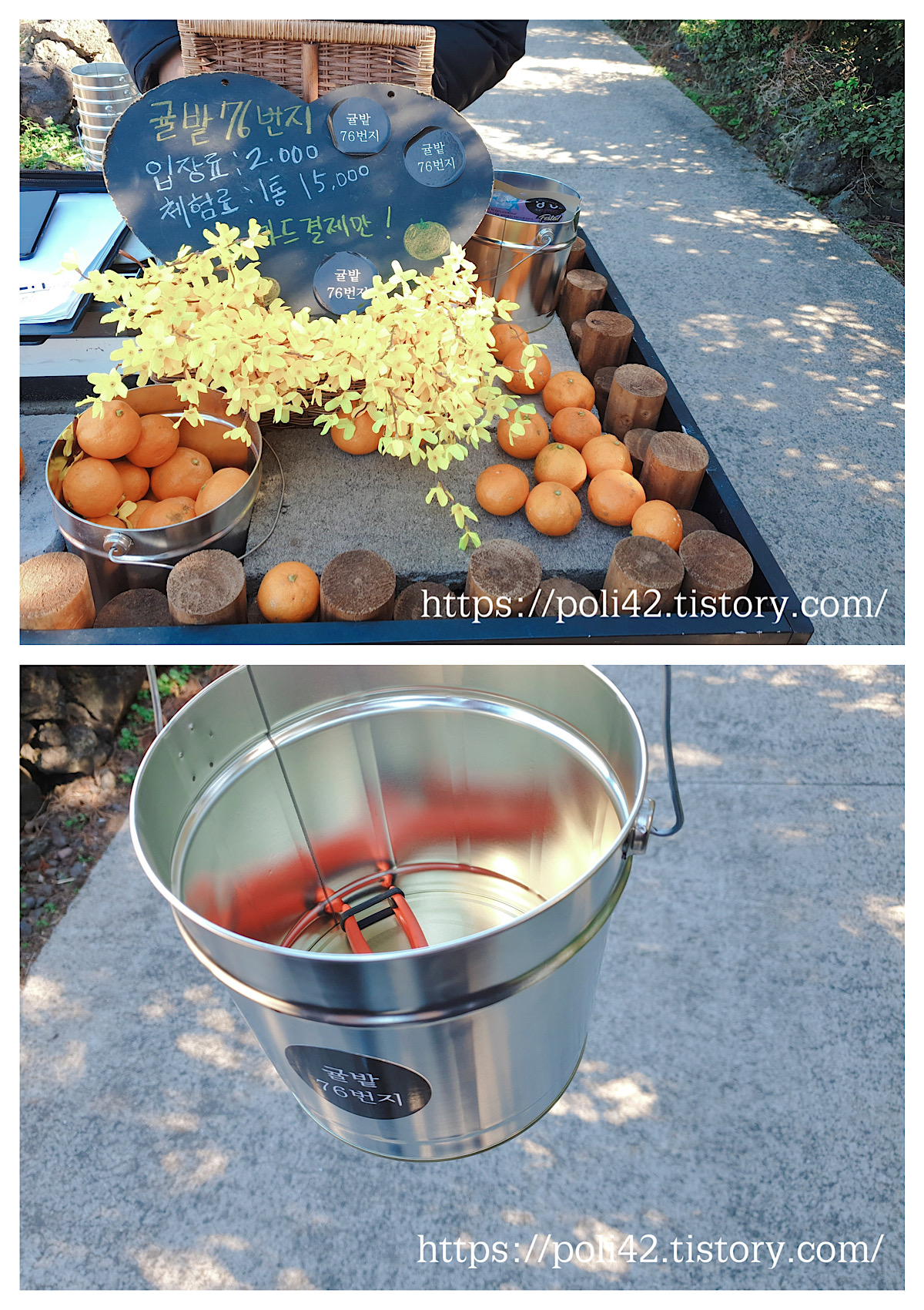 귤밭 76번지 입장료는 2000원, 귤 따기 체험료는 양동이 한통에 15000원 받고 있더라고요.