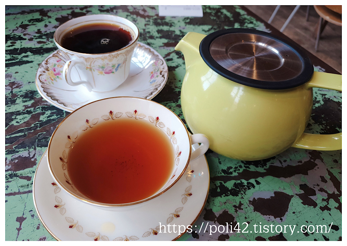 빈티지한 예쁜 찻잔에 음료가 나왔어요.