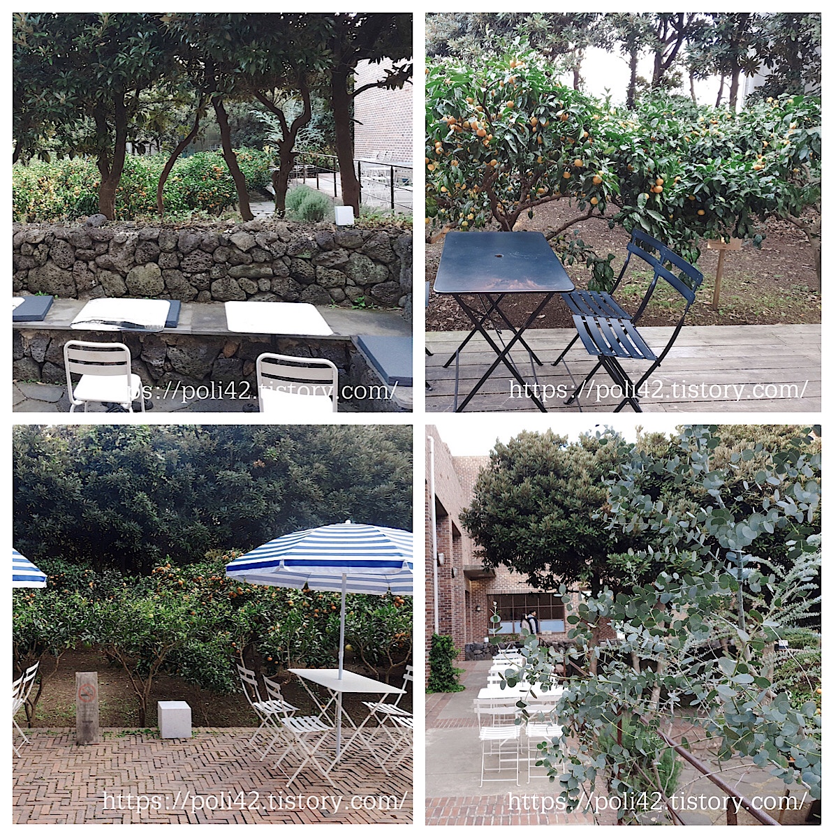 귤밭 주변으로는 야외에서 차 한잔 할 수 있도록 테이블과 의자가 마련되어 있습니다.