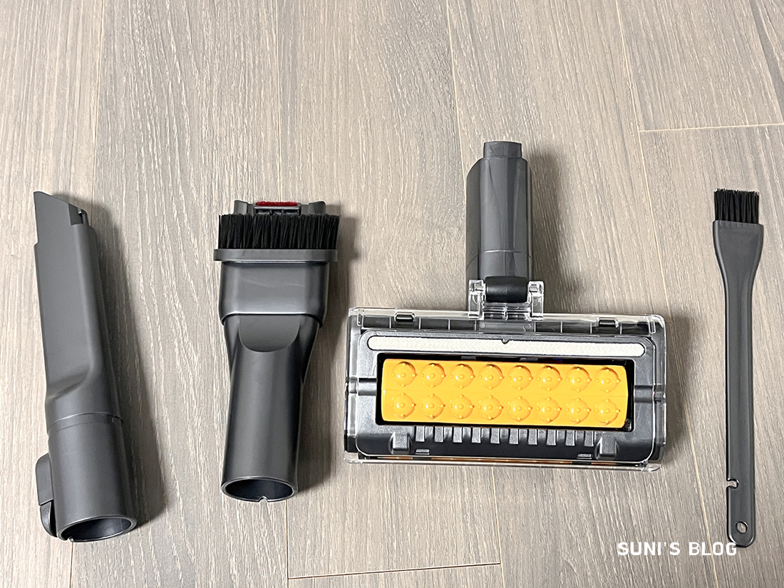 왼쪽부터 틈새청소 도구 2가지, 침구청소, 그리고 청소기 내부청소