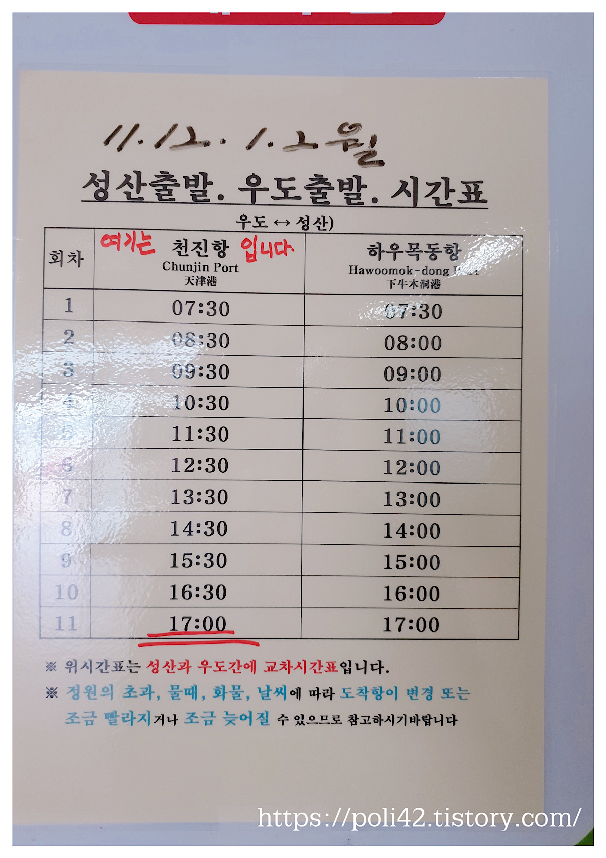 성산포 항에서 우도 가는 배는 오전 7시 30분 부터 오후 5시 까지 30분에 한번씩 있고.