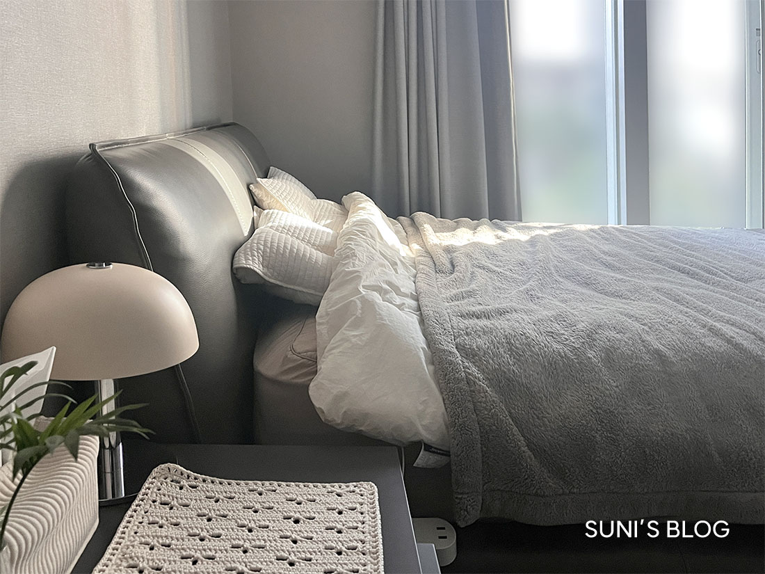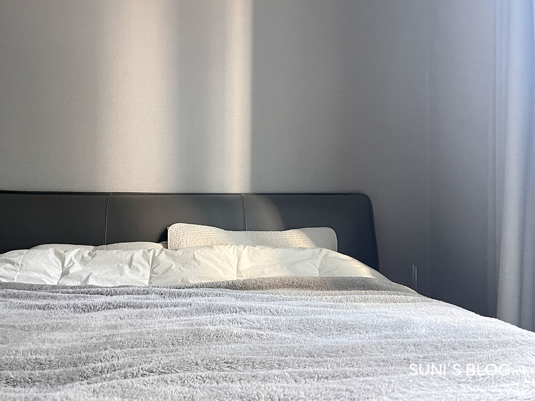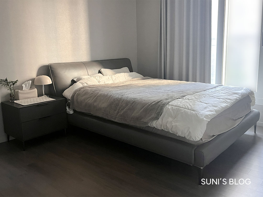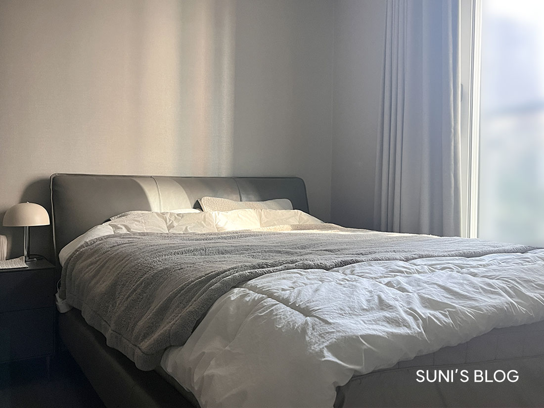 따뜻한 톤의 그레이고, 딥한 느낌의 그레이 컬러의 침대와 협탁