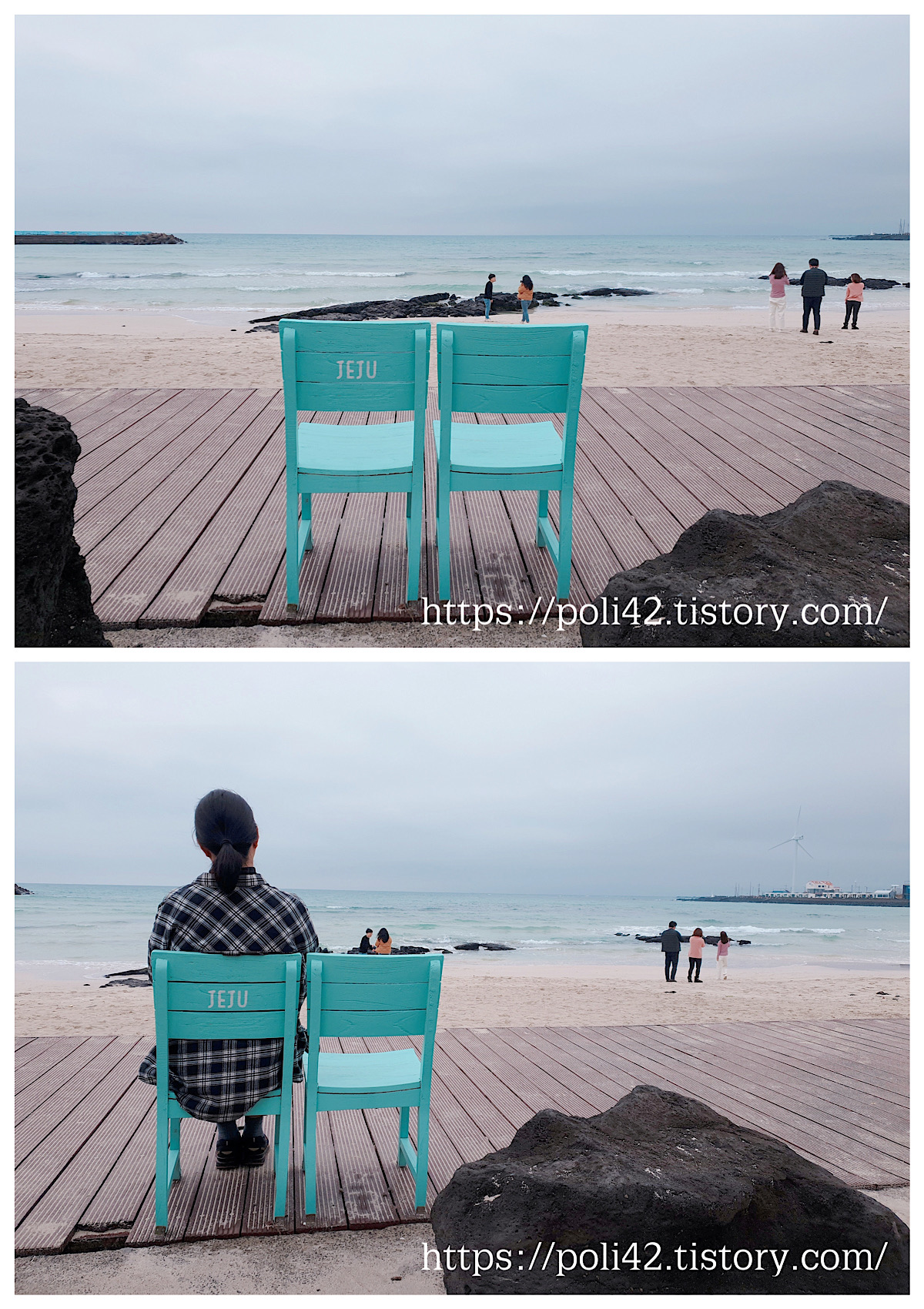 월정리 해변에 놓인 의자에 앉아 사진도 찍어봅니다.