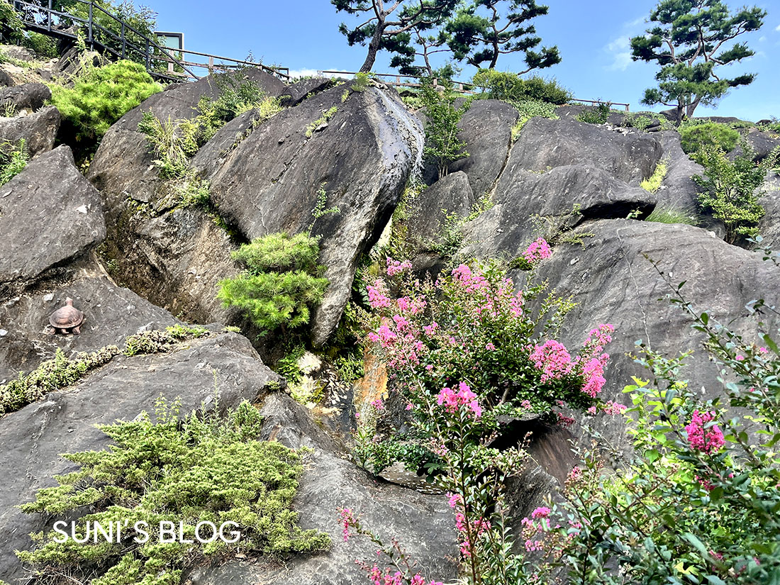 커다란 암석 사이로 핀 꽃과 식물들을 바라보며