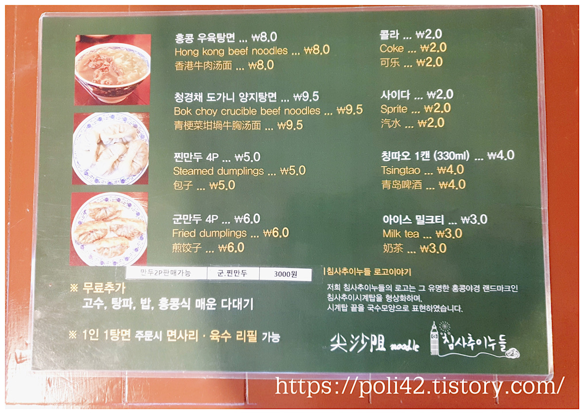 가성비도 좋아 종종 찾아 가는 곳이예요. 특히 날씨가 추워지면 저는 여기 침사추이 누들 음식이 그렇게 생각이 나더라고요.