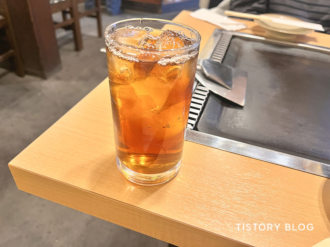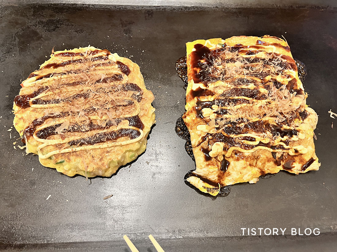 우롱차 두 잔과 기본 오코노미야끼를 주문하고 치즈 오믈렛 같은 걸 주문했습니다.