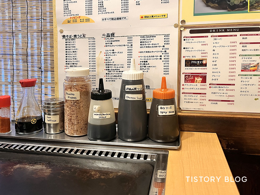 방문당시에는 잘 몰랐는데 오코노미야끼, 야끼소바 외에도 여러 가지 철판구이를 파는 곳 같더라고요